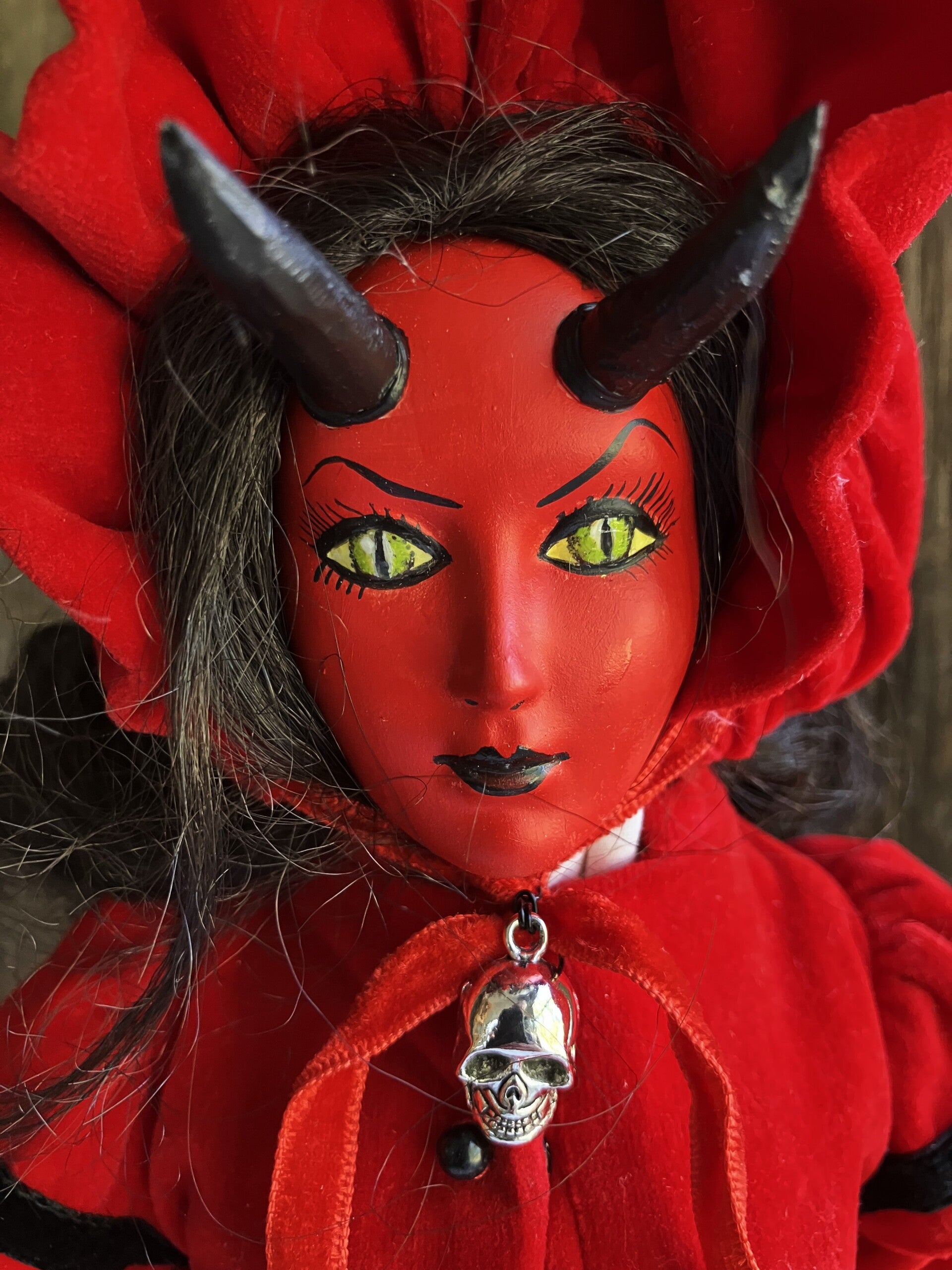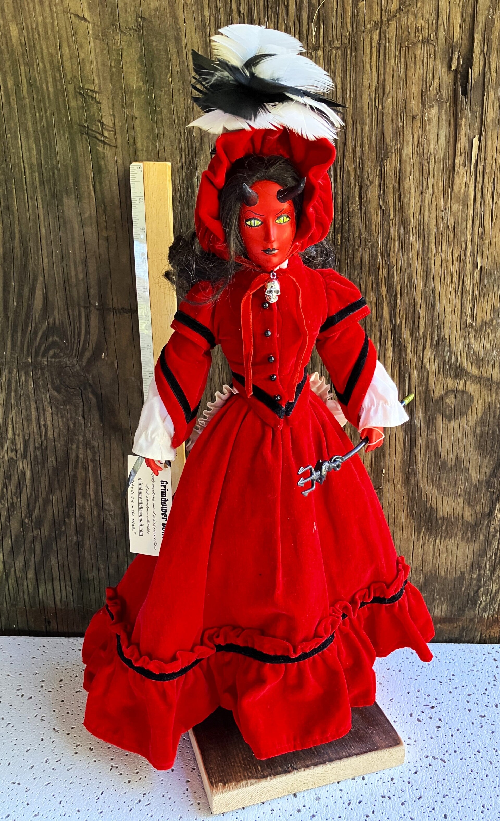 Repainted porcelain doll with added horns and trident accessory.